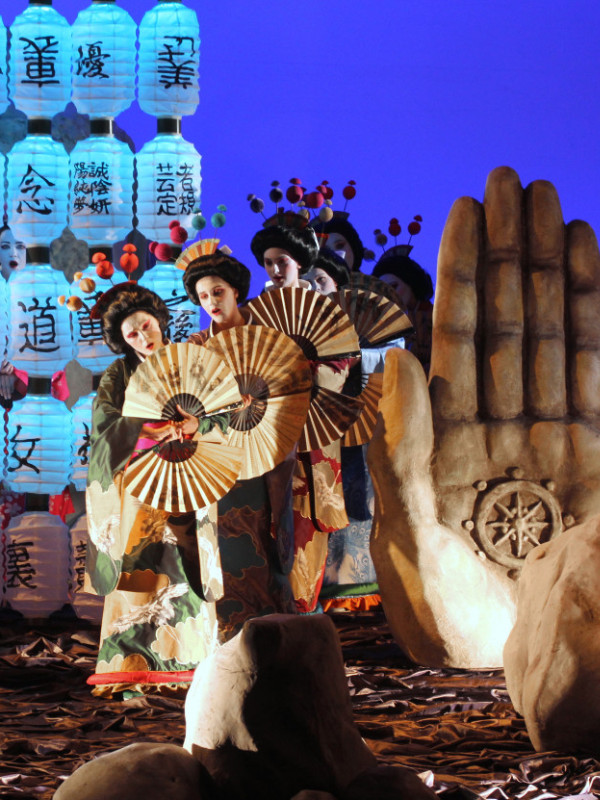 В спектакле «Зазеркалья» постановщики акцентировали тему поруганных традиций. Отказ героини от веры предков разрушил гармонию её мира, и на сцене эта драма предстаёт в виде огромной статуи Будды, которая, как наваждение, сопровождает каждый миг земного пути Чио-Чио-сан, минуты ее глубинного сосредоточения — состояния, близкого к медитации. Художник Владимир Фирер метафорически передал эту атмосферу пространство спектакля решено как сад камней, место для пребывания бесконечно одинокой души.