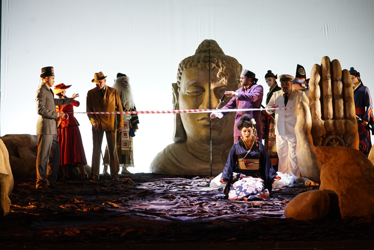 В спектакле «Зазеркалья» постановщики акцентировали тему поруганных традиций. Отказ героини от веры предков разрушил гармонию её мира, и на сцене эта драма предстаёт в виде огромной статуи Будды, которая, как наваждение, сопровождает каждый миг земного пути Чио-Чио-сан, минуты ее глубинного сосредоточения — состояния, близкого к медитации. Художник Владимир Фирер метафорически передал эту атмосферу пространство спектакля решено как сад камней, место для пребывания бесконечно одинокой души.