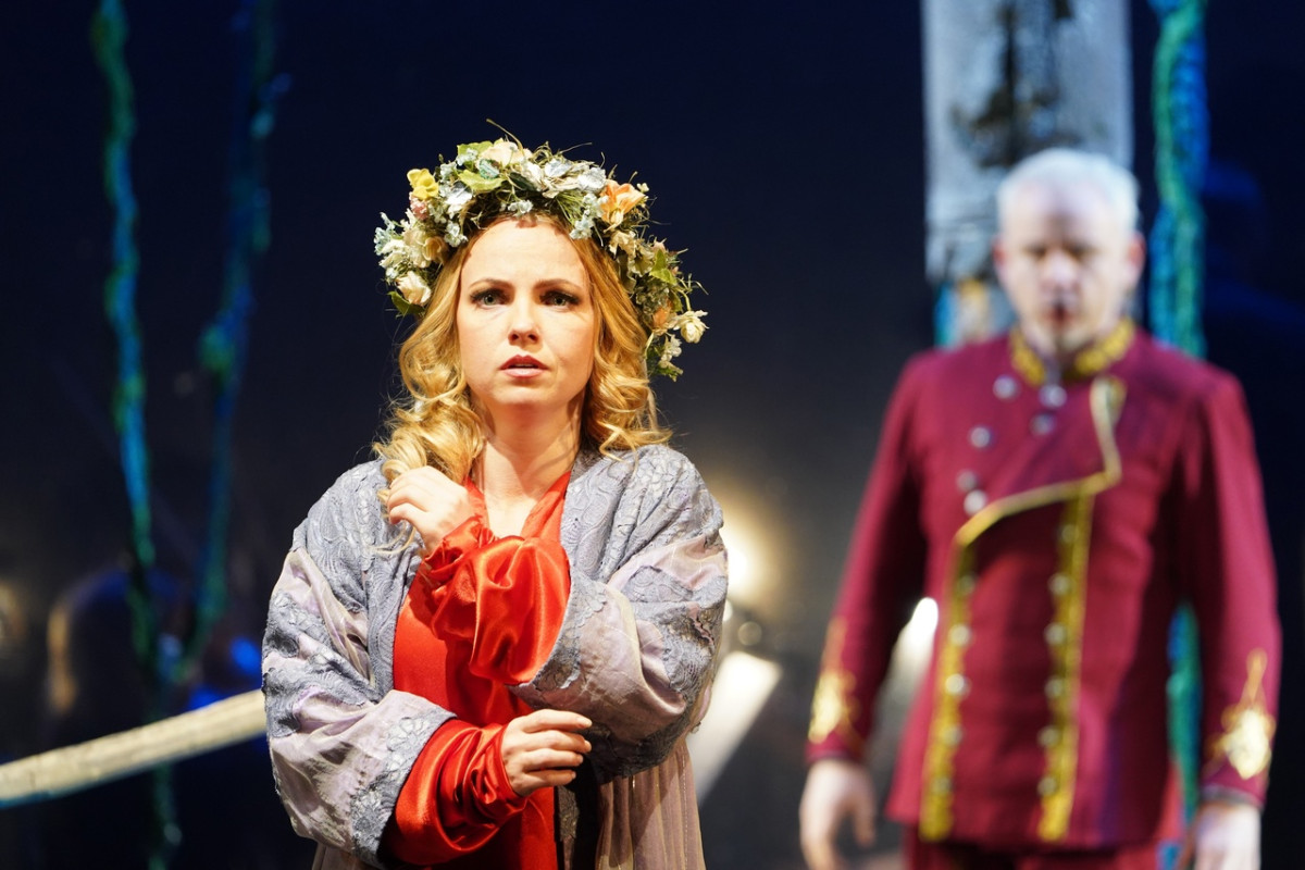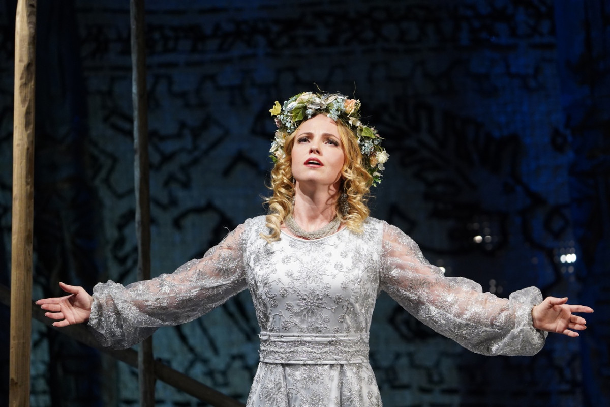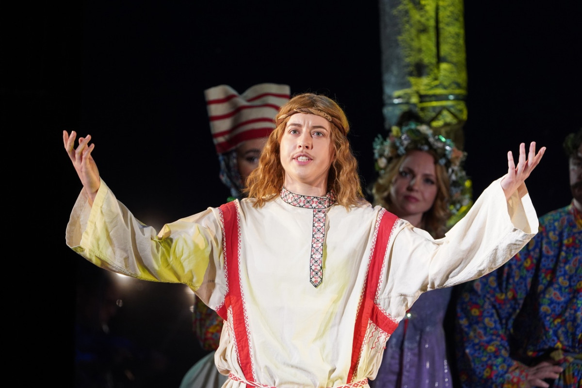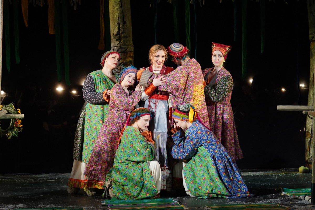 «В спектакле режиссера Василия Заржецкого и художника Алексея Левданского найдена точная и очень красивая метафора. Зеркало сцены образуют широкие боковые порталы и огромный проем в стене — там, в глубине помещается оркестр. В таинственной синей мгле неба сияют ледяные звезды, а внизу теплится подсветка пультов — возникает перекличка, единство миров горнего и дольнего. А действие разворачивается на авансцене, расширенной за счет оркестровой ямы. Хотя перекрыта она не наглухо из-под земли бьют фонтаны снега, на тростях возносятся птицы из свиты Весны, под землей скрывается бегством Снегурочка, а потом туда же с размаху самоубийственно низвергнется Мизгирь. Пространство расчерчено жердями, укрепленными под разным углом, и резными столбами, порталы декорированы ковриками с квазифольклорными вышивками, костюмы Стефании Граурогкайте также обыгрывают древнерусские мотивы. Все вместе — именно стилизация, которой присутствие позади оркестра во главе с Павлом Бубельниковым (как всегда, соединяющим отточенное мастерство, тонкий вкус, элегантную выделку жеста) само по себе сообщает несколько ироническую отстраненность. Это, конечно же, игра, сказка, хоть и про сверхсерьезные вещи...» (Дмитрий Циликин. Прививка красоты // Ведомости. 2013. 29 марта).